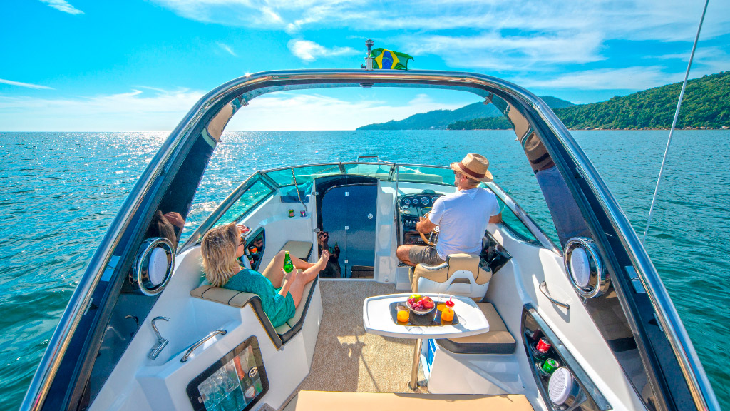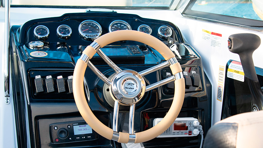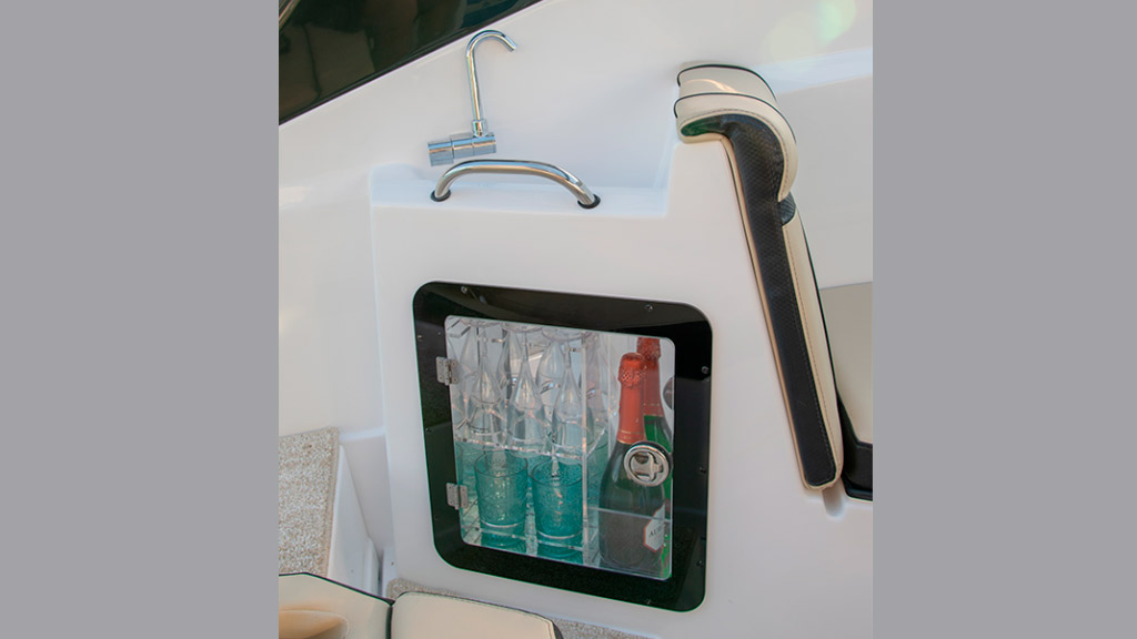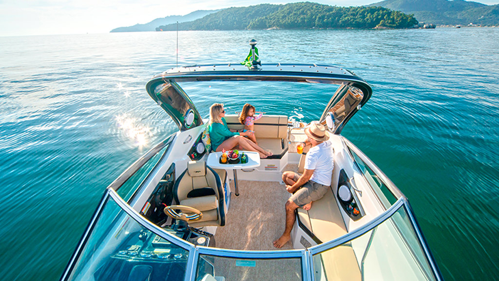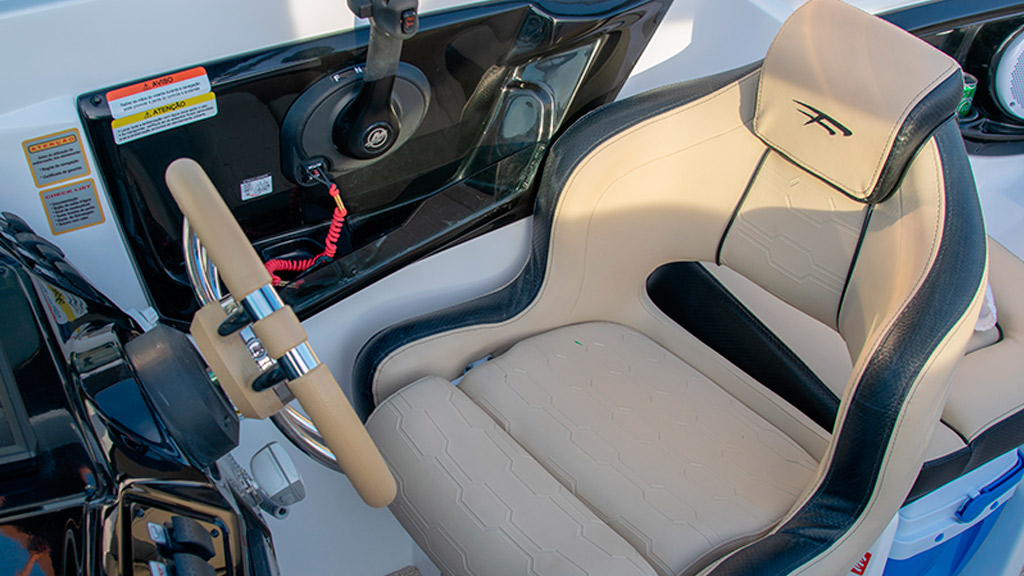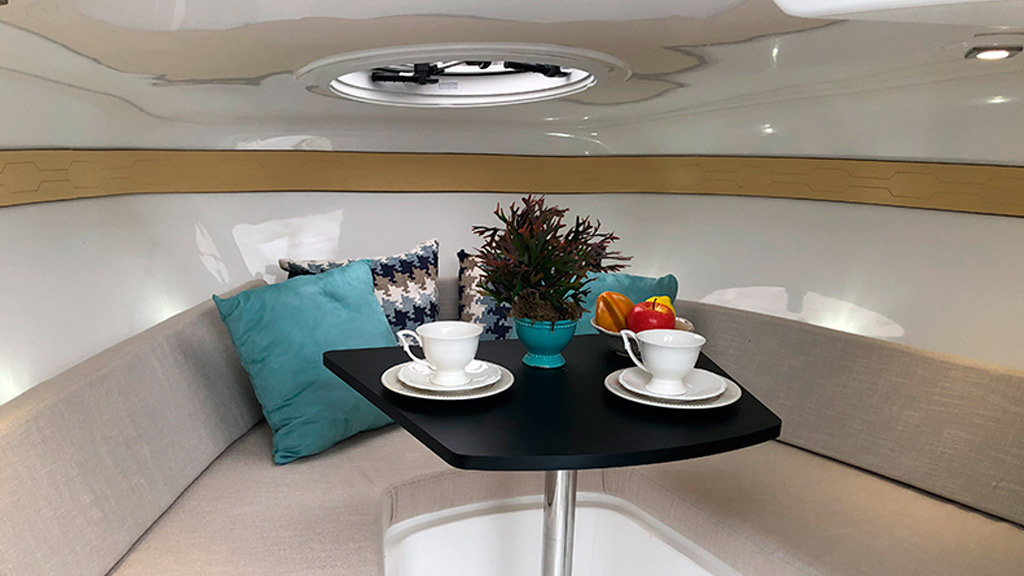 Sua cabine sofisticada e funcional conta com banheiro, revestimentos em tecidos requintados, armário em madeira teca e suporte para coletes. O cockpit e a plataforma têm espaço para melhor interação entre os passageiros.
