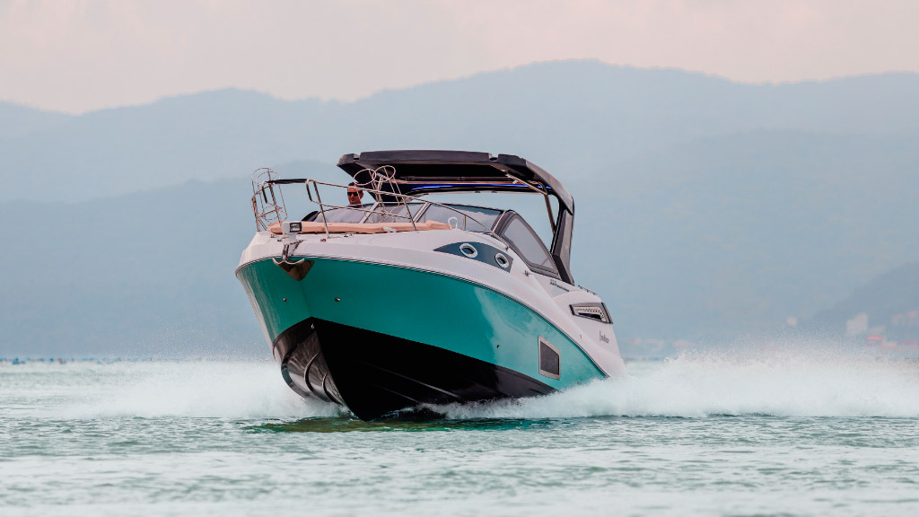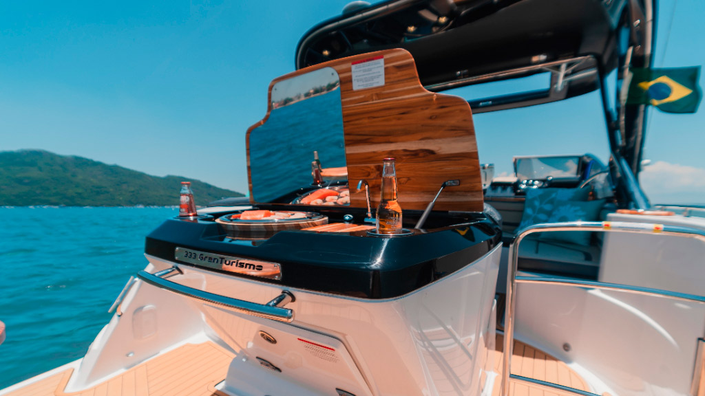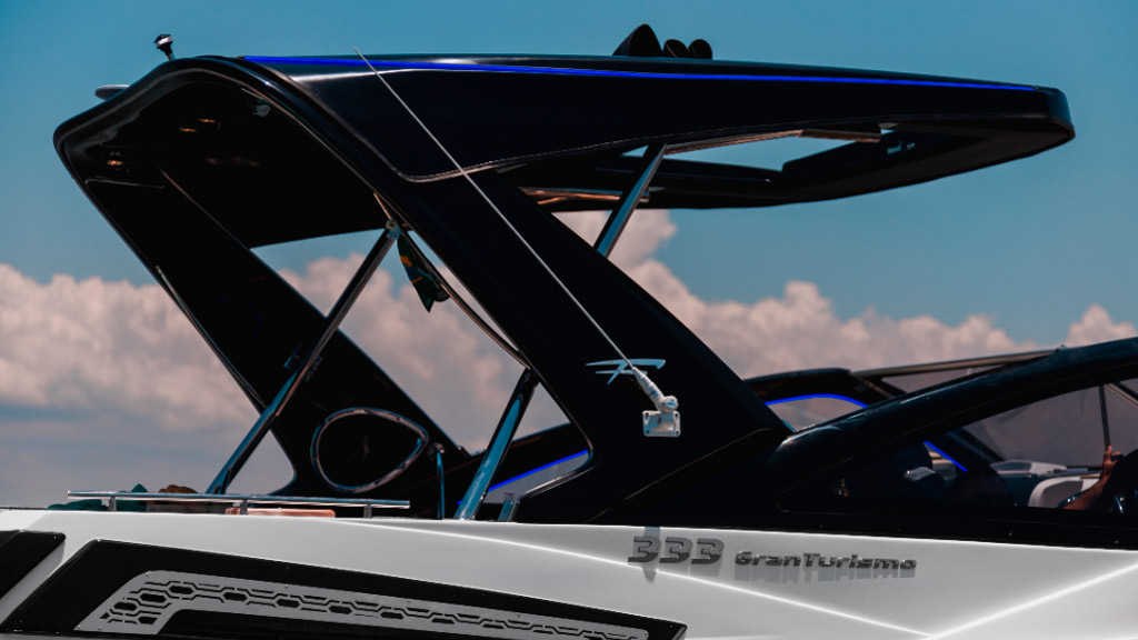 A Focker 333 Gran Turismo, edição comemorativa de 30 anos do estaleiro, é marcada pelo design imponente e esportivo, trazendo um acabamento exclusivo em led.