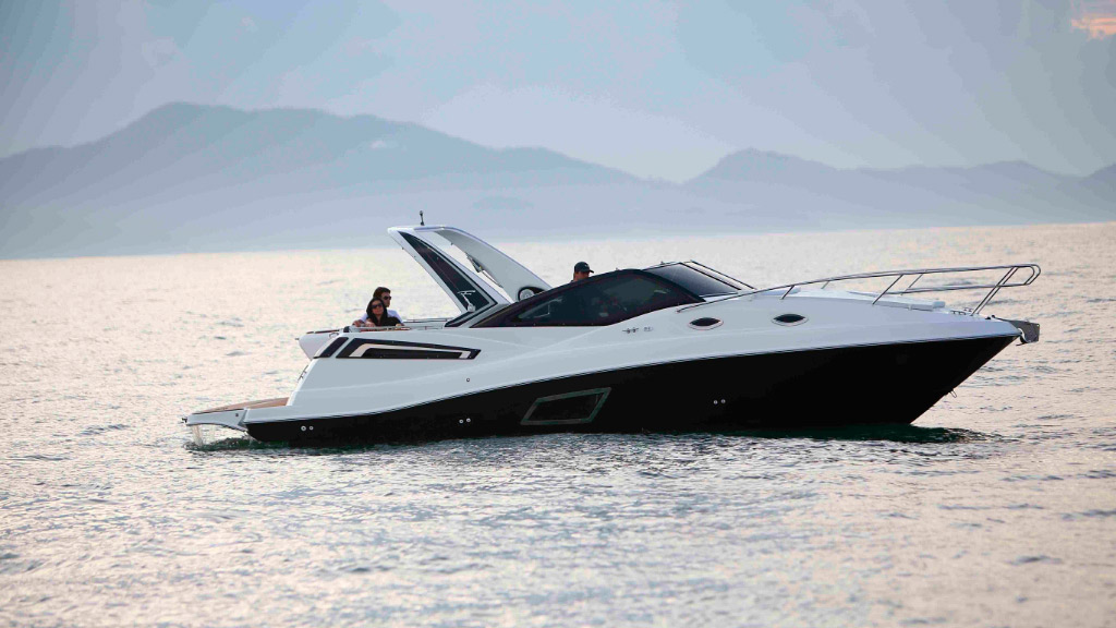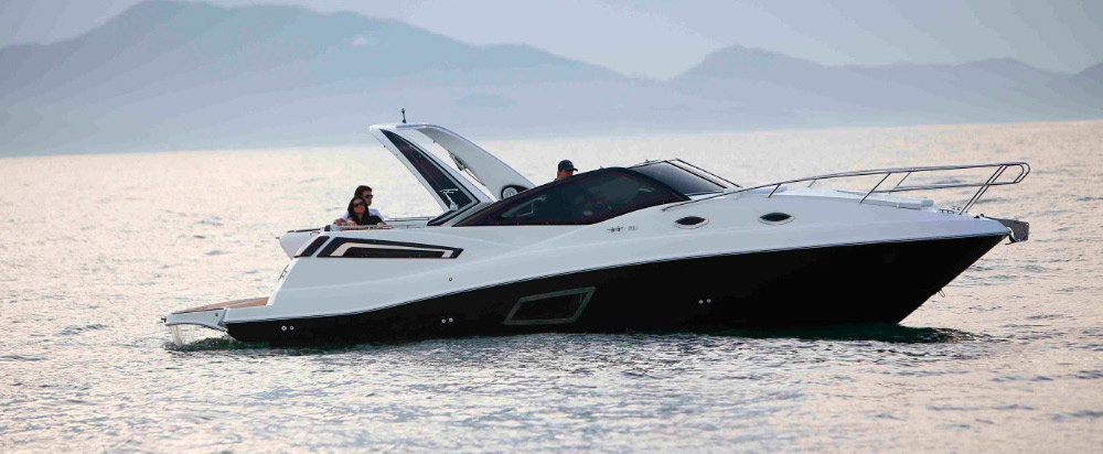 Carro chefe da linha Cruiser Fibrafort, a Focker 330 é notável pelo design e propulsão de seus dois motores centro rabeta.