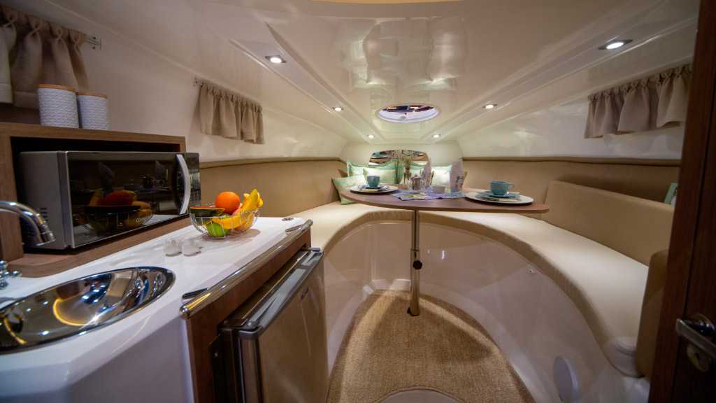 Amplo espaço no cockpit aliado ao belo espaço gourmet em sua plataforma de popa, proporciona momentos de conforto e lazer.