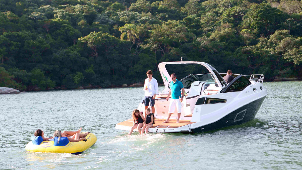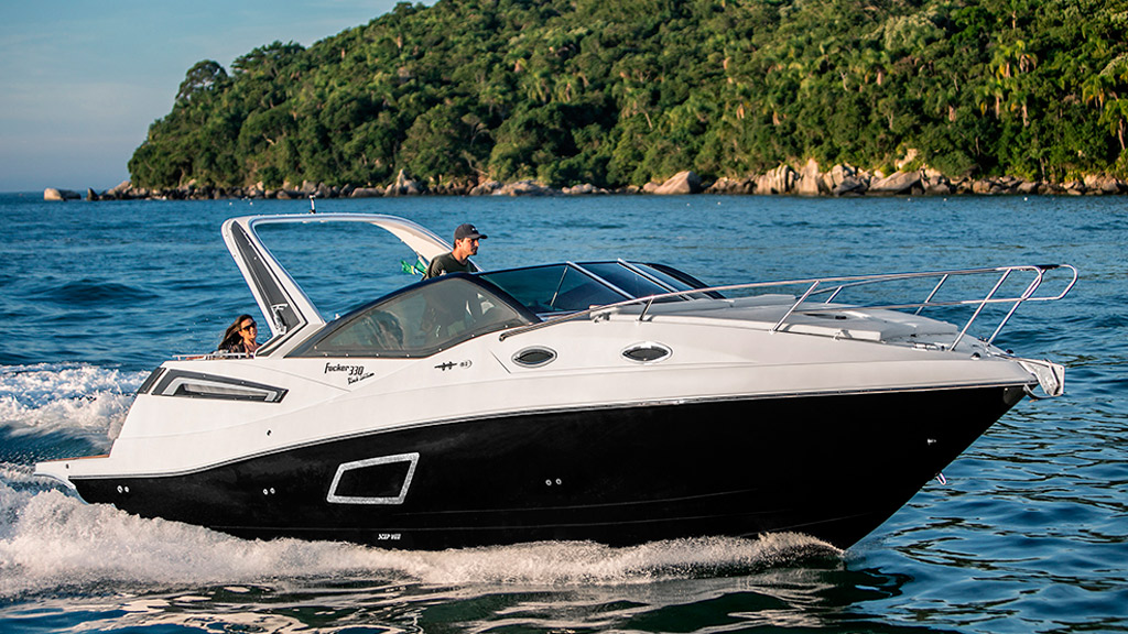 Carro chefe da linha Cruiser Fibrafort, a Focker 330 é notável pelo design e propulsão de seus dois motores centro rabeta.