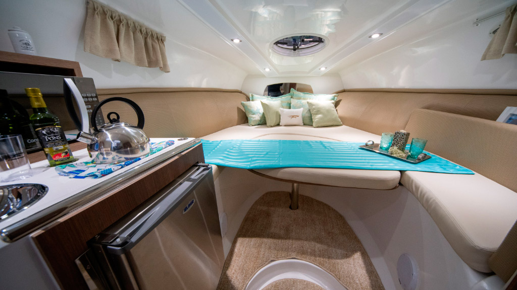 Amplo espaço no cockpit aliado ao belo espaço gourmet em sua plataforma de popa, proporciona momentos de conforto e lazer.