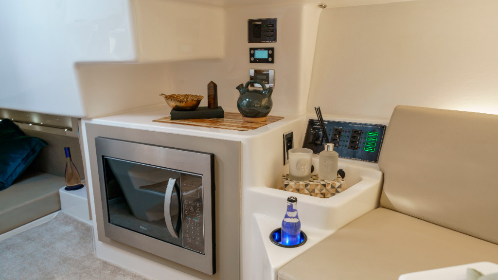 Inúmeros diferenciais estão a bordo desse lançamento, mas a imponência do motor de popa junto com as linhas esportivas da navegação tornam o design da Focker 370 GTX ainda mais imponentes na água.